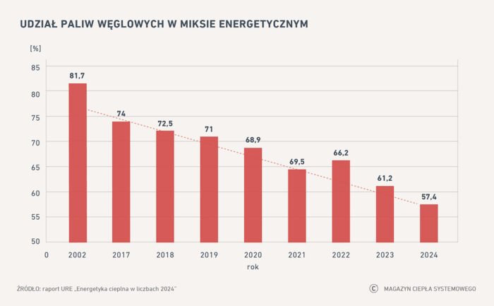 Węgiel. Udział węgla (kamiennego i brunatnego) w produkcji ciepła systematycznie spada i w 2024 roku osiągnął 57,4 proc. (spadek z 61,2 proc. w 2023 roku).